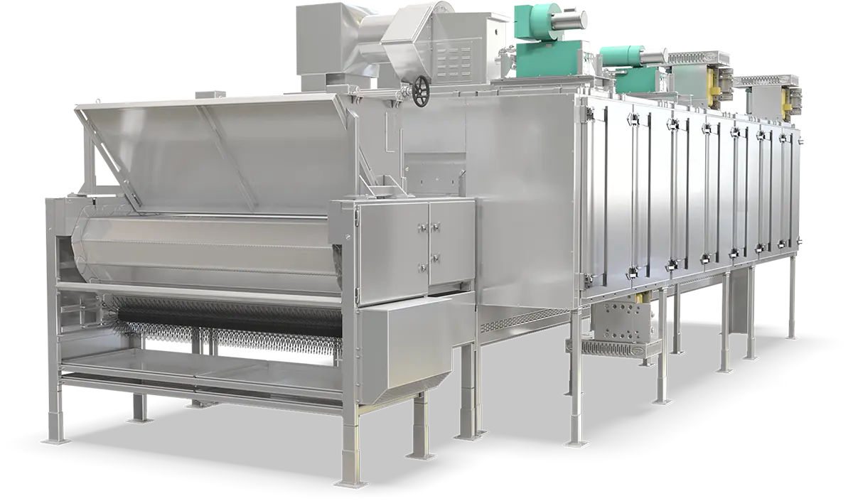 The conveyor returns outside the drying chamber for ease of cleaning. Integral coolers, if required, stop the drying or roasting process very quickly and discharge products at close to ambient temperatures